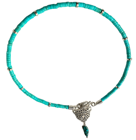 Natural Turquoise Heishi Choker Necklace with Rhinestone Spacers and Hammered Toggle Clasp Focal