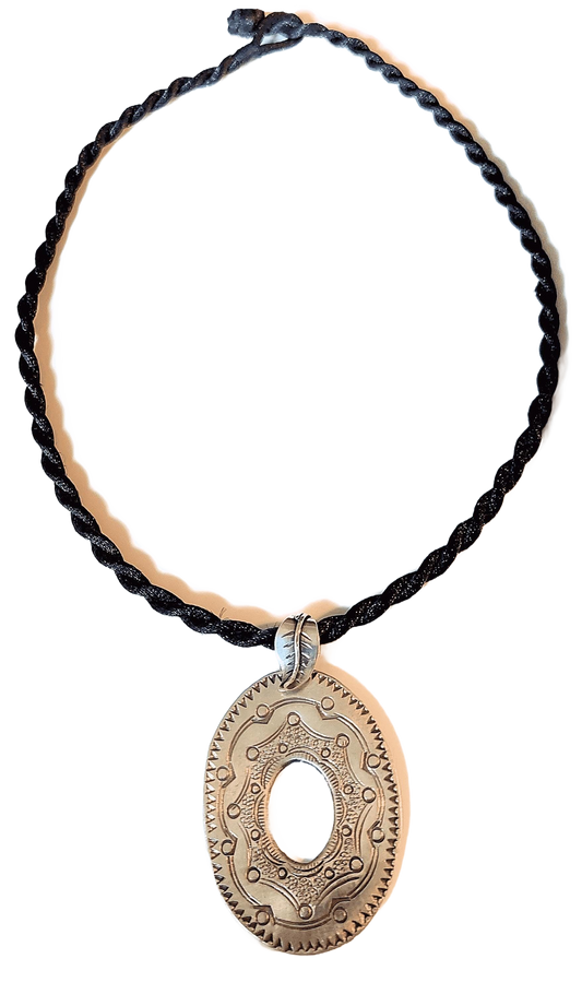 Hill Tribe Fine Silver Oval Donut Pendant on Black Satin Twisted Cord Necklace