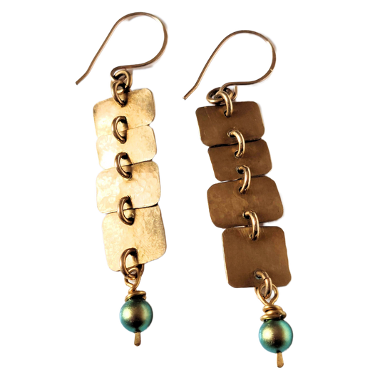 Hammered Bronze Articulated Earrings with Chartreuse Swarovski Crystal Pearl Drop OOAK