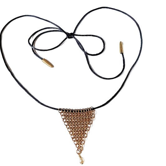 Rectangular European 4-in-1 Brass Chain Maille Pendant on Black Silk Cord Necklace