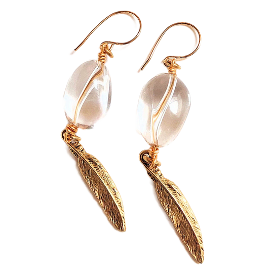 Polished Rock Crystal Quartz Earrings with Sterling Silver-Plated Pewter Feather Charm