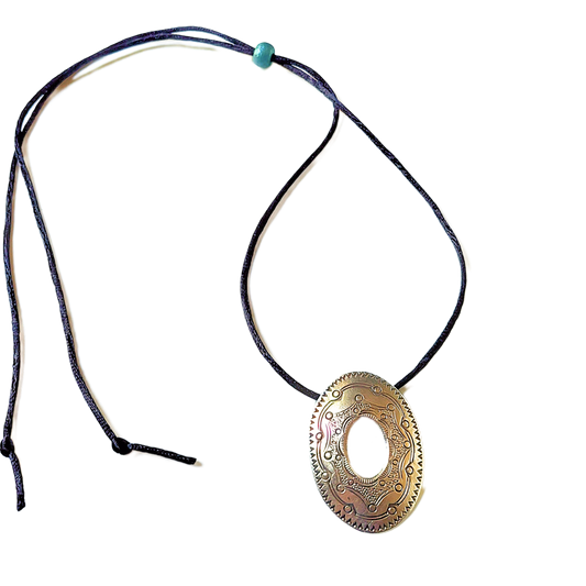Hill Tribe Fine Silver Oval Donut Pendant Necklace on Black Satin Cord