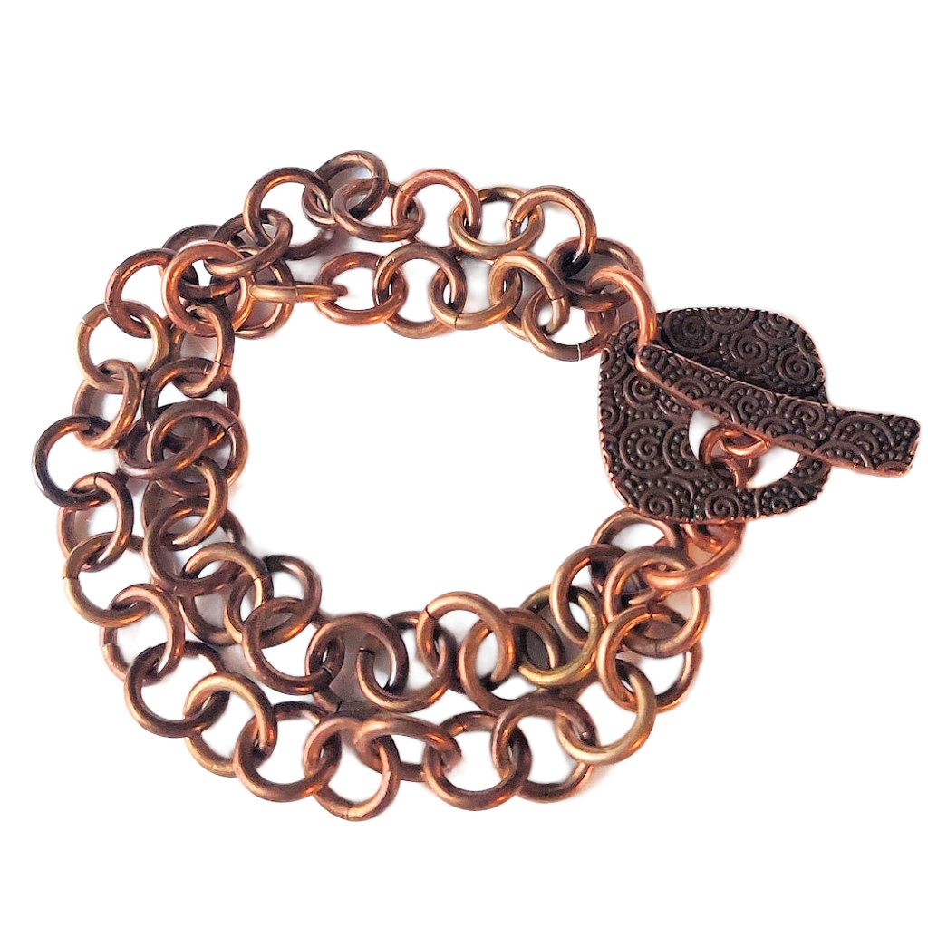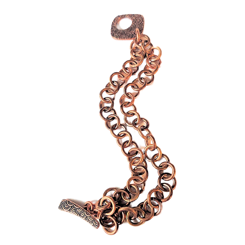 1-in-1 chain made with 16 gauge copper jump rings. The gorgeous embossed antique copper-plated pewter toggle clasp was designed by Tierra Cast and handcrafted in the USA. The chains are treated with Renaissance Wax to help prevent the skin staining some people may experience when wearing copper.