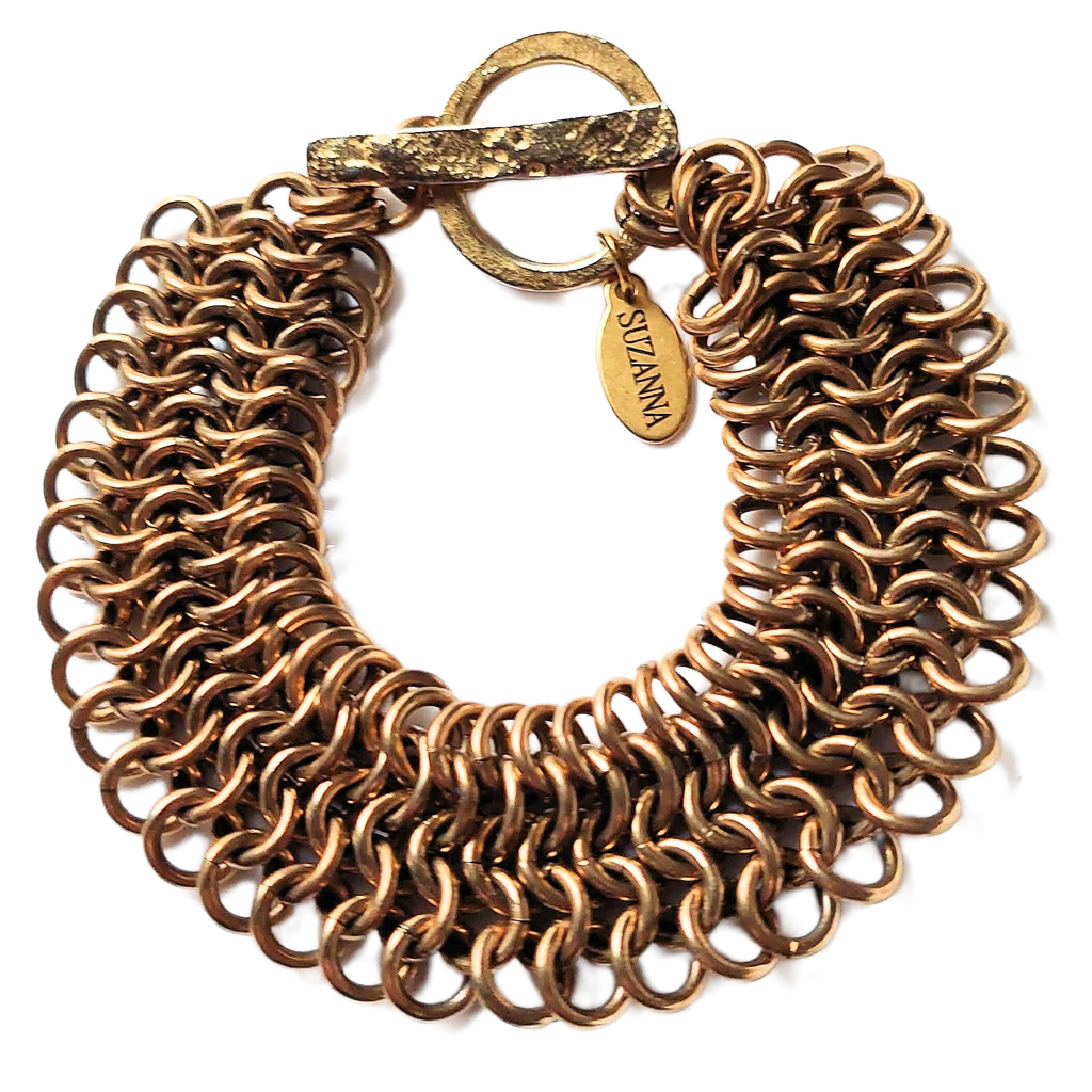 Our chic and slinky 7" long and 3/4" wide brass European 4 in 1 chain maille cuff bracelet shimmers like gold and feels as beautiful as it looks with a substantial yet comfortable weight. Finished with a 24k gold-plated pewter toggle clasp, this is a striking accessory for special occasions and adds a pop of golden pizzazz to everyday outfits.