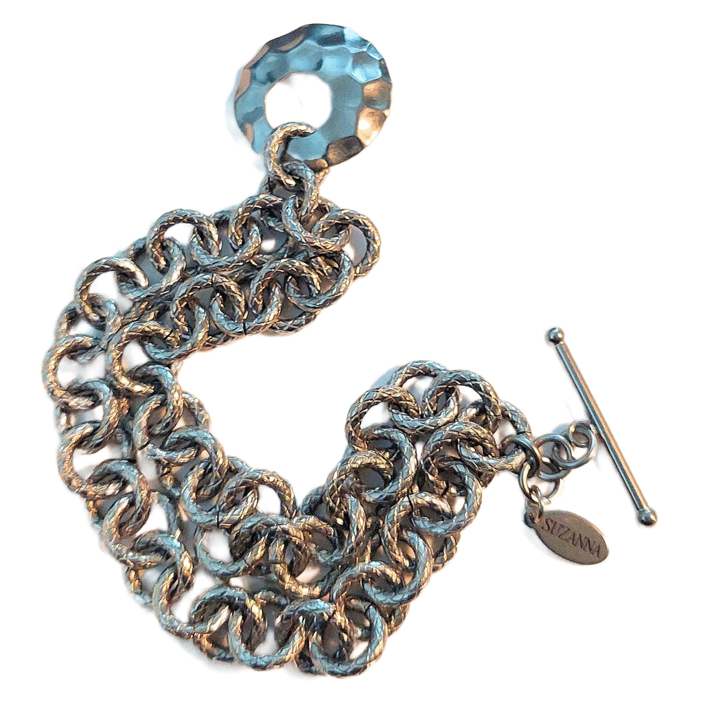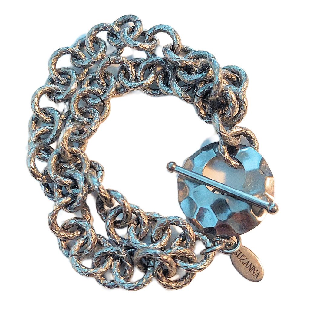 - The bracelet is finished with a hammered stainless steel toggle clasp.
