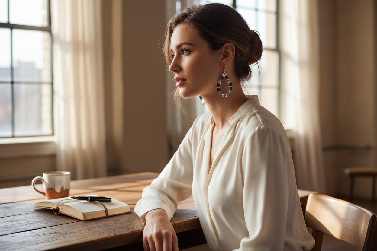 Denim Lapis Lazuli & Silver Teardrop Hoop Beaded Earrings