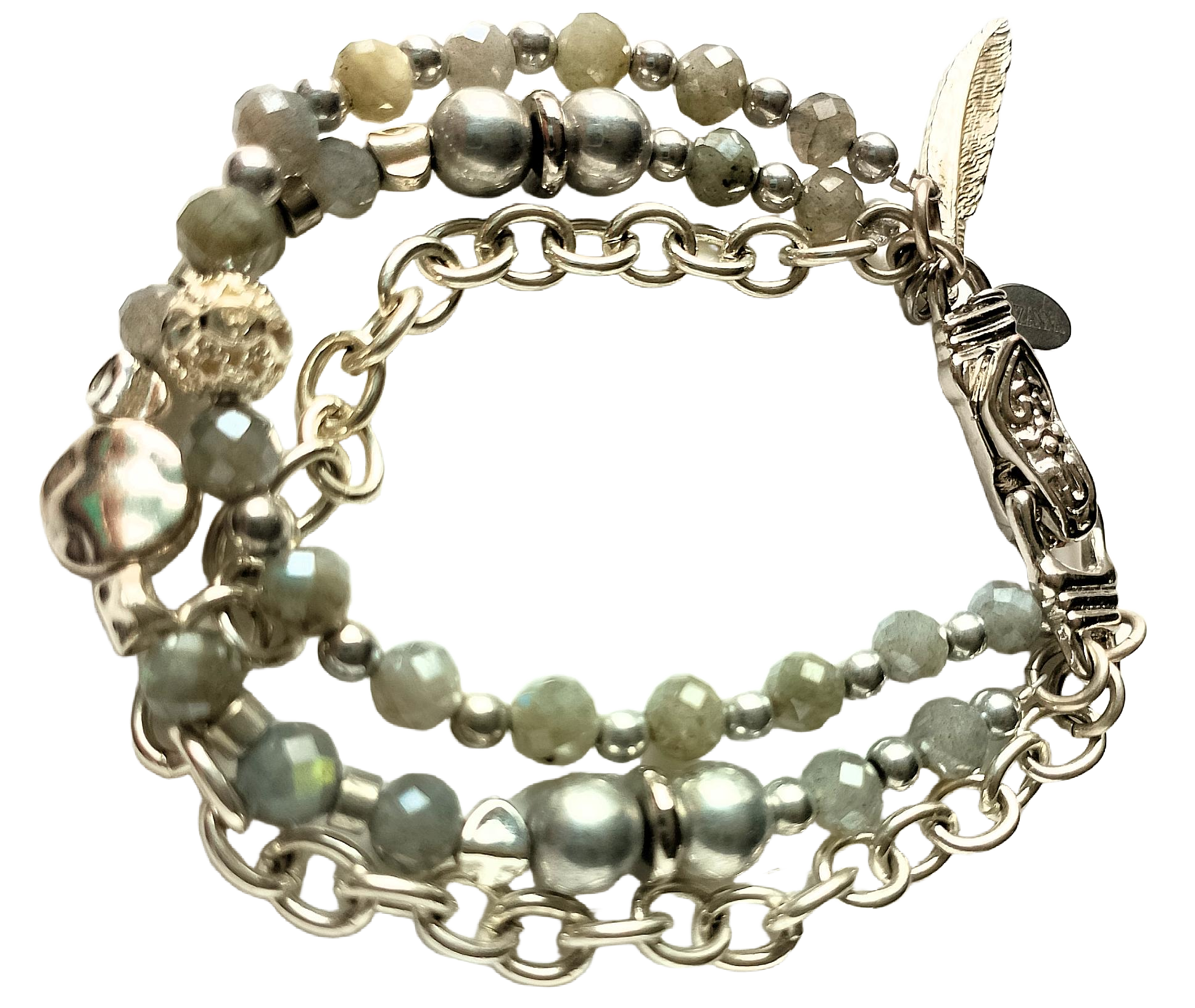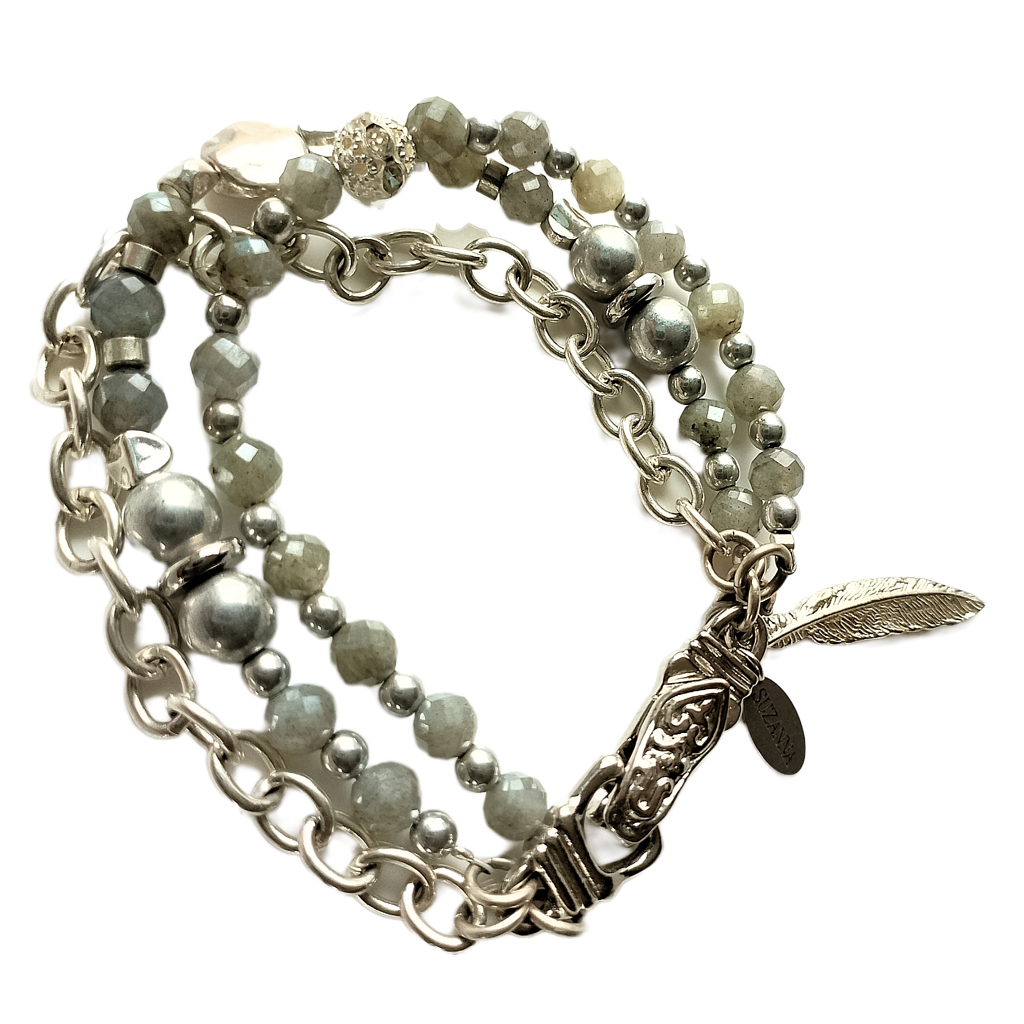 Our Faceted Labradorite, Silver Druk Czech Glass Beads, Silver Chain, and sterling Silver Three-Strand Bracelet are all about understated elegance. With its smoky gray and silver vibe and pops of shiny silver spacers, it effortlessly transitions from day to evening.