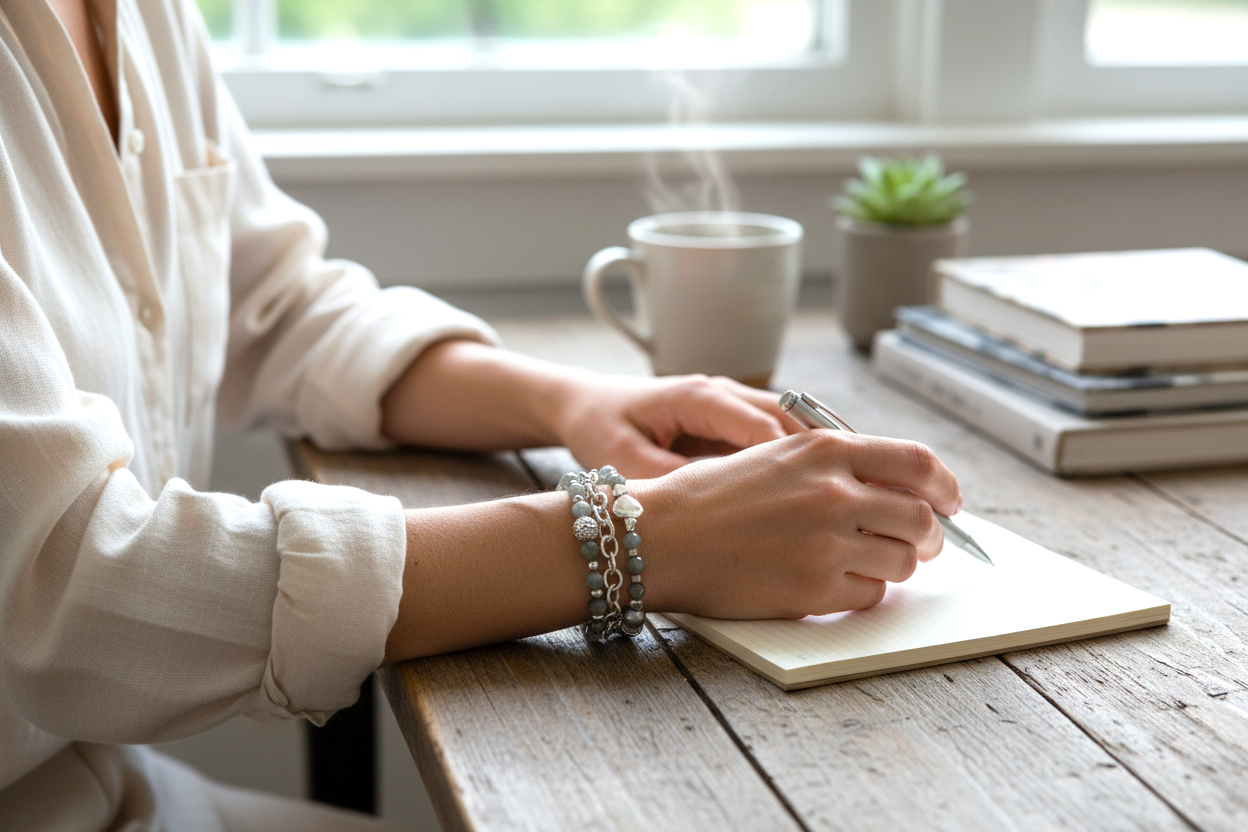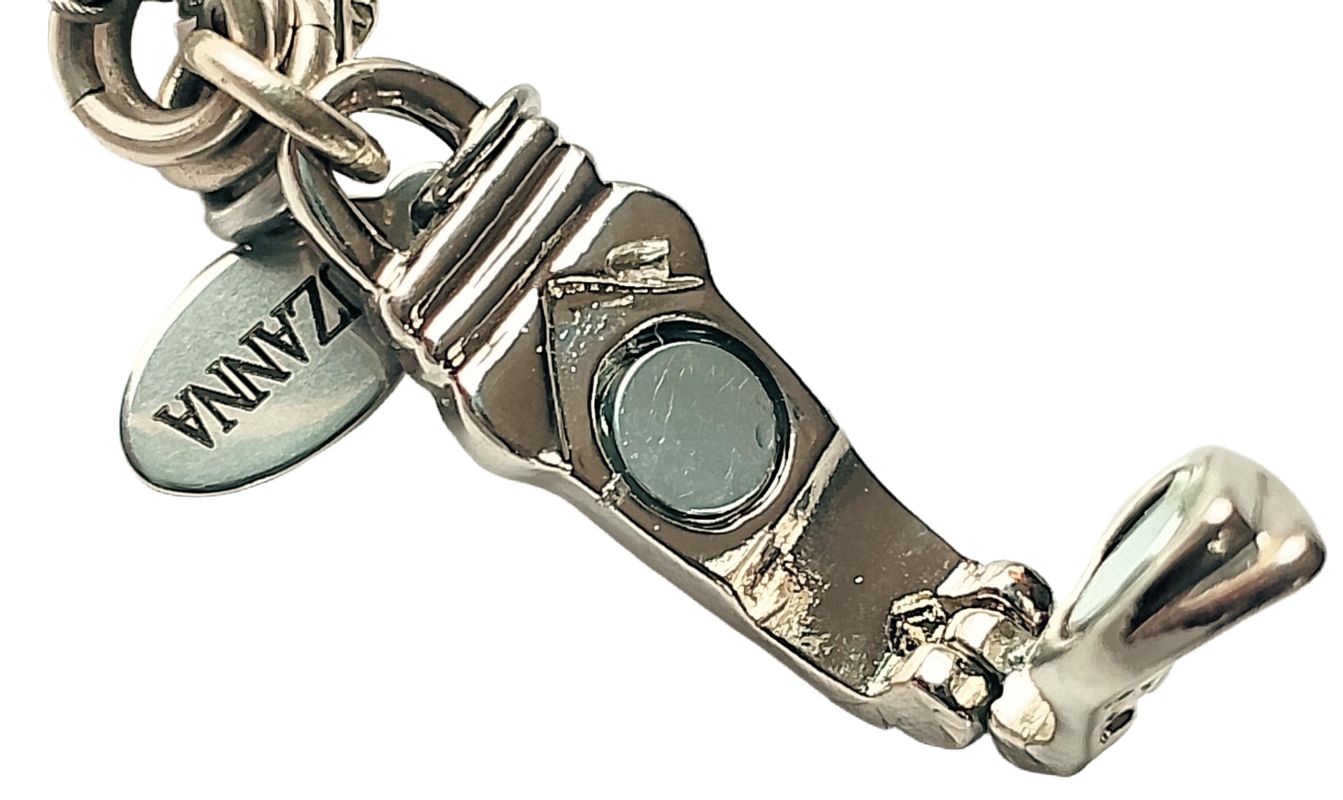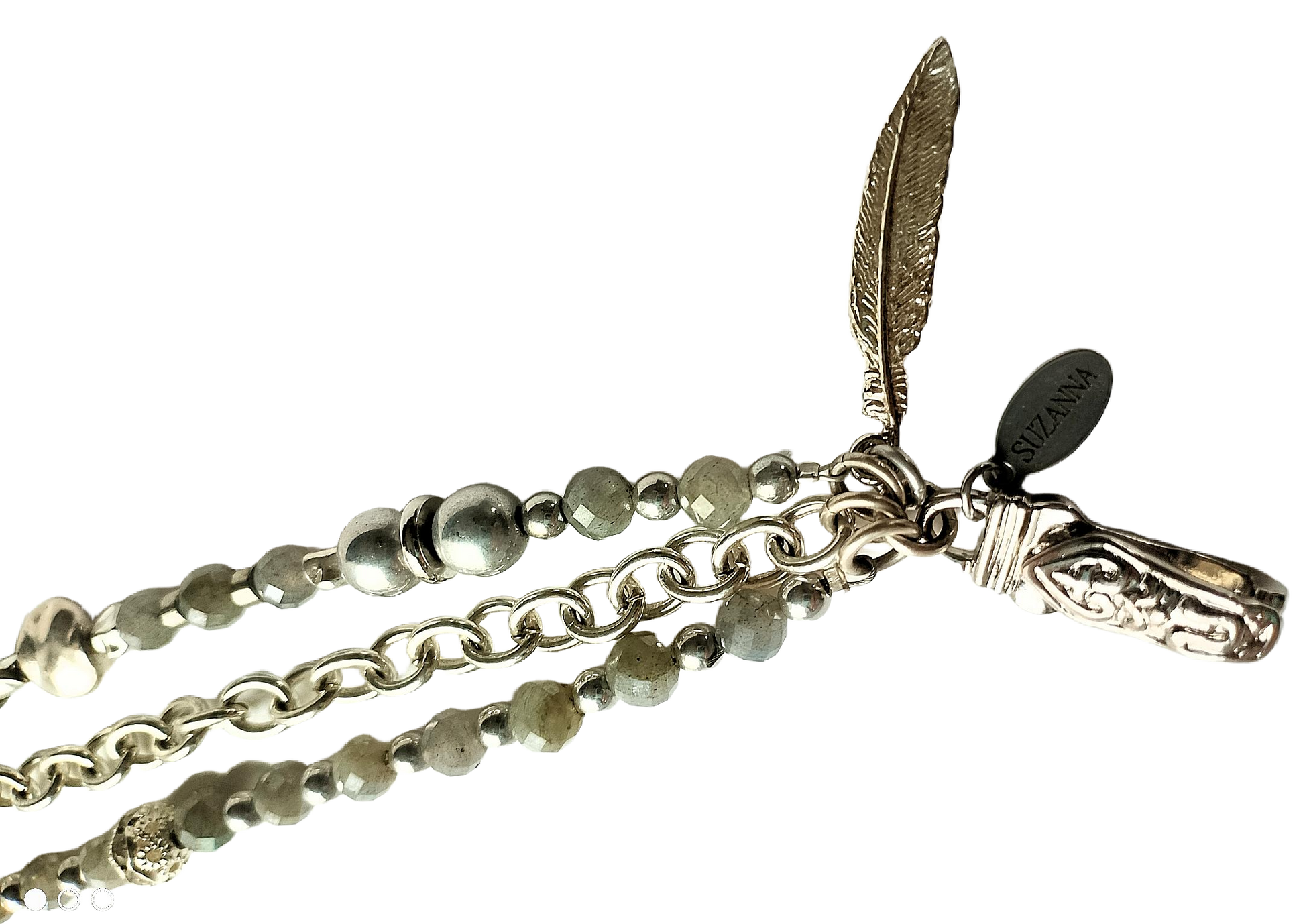 All the strands come together with a showy silver fold-over magnetic clasp handmade in Germany by ClaspGarten, a nearly century-old brand (est. 1921)! The bracelet is embellished with a sterling silver-plated pewter feather charm, and our signature SUZANNA logo tag in silver. All jump rings, spacers, crimps, and crimp covers are sterling silver.