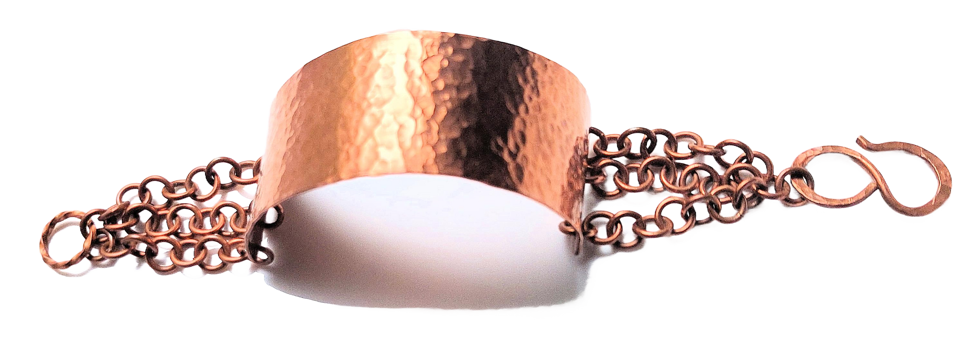 Our artful & elegant handmade copper 1" wide half-cuff is cut from copper sheet, filed, sanded, and hammered for sparkle. It features a non-chemical naturally rich patina that will deepen over time. The half-cuff measures 4-1/2" gently curved to fit over the top part of the wrist ending at each side of the wrist. A trio of copper chains are attached to each side to form the underside and closure of the bracelet. One side of the chain bracelet measures 3-1/2" and is finished with a handmade hammered copper 1" long S clasp that fits into a twisted copper ring on the other side of the chain that measures 2-1/2". This striking bracelet is perfect for everyday casual wear and can be worn for any occasion. Complements our hammered copper teardrop earrings, as pictured! Arrives in a black satin drawstring pouch for storage.