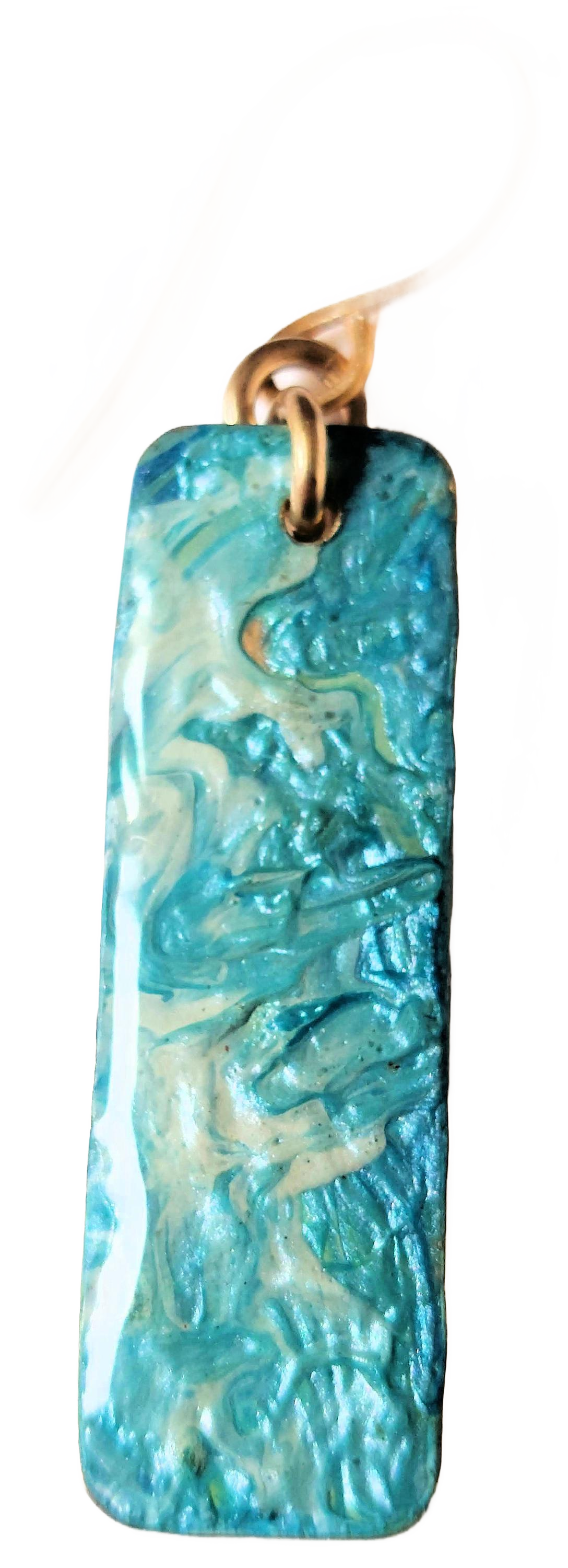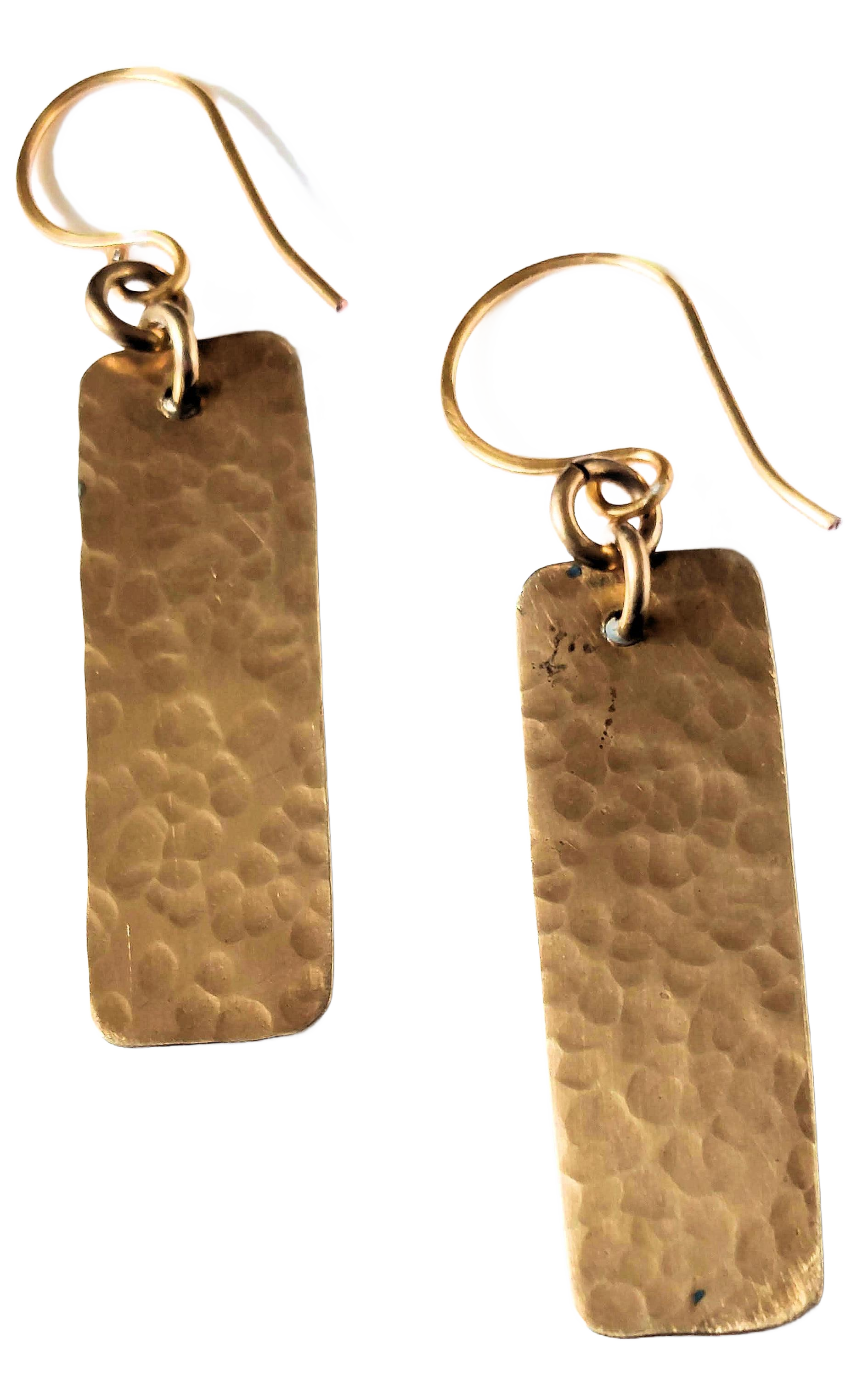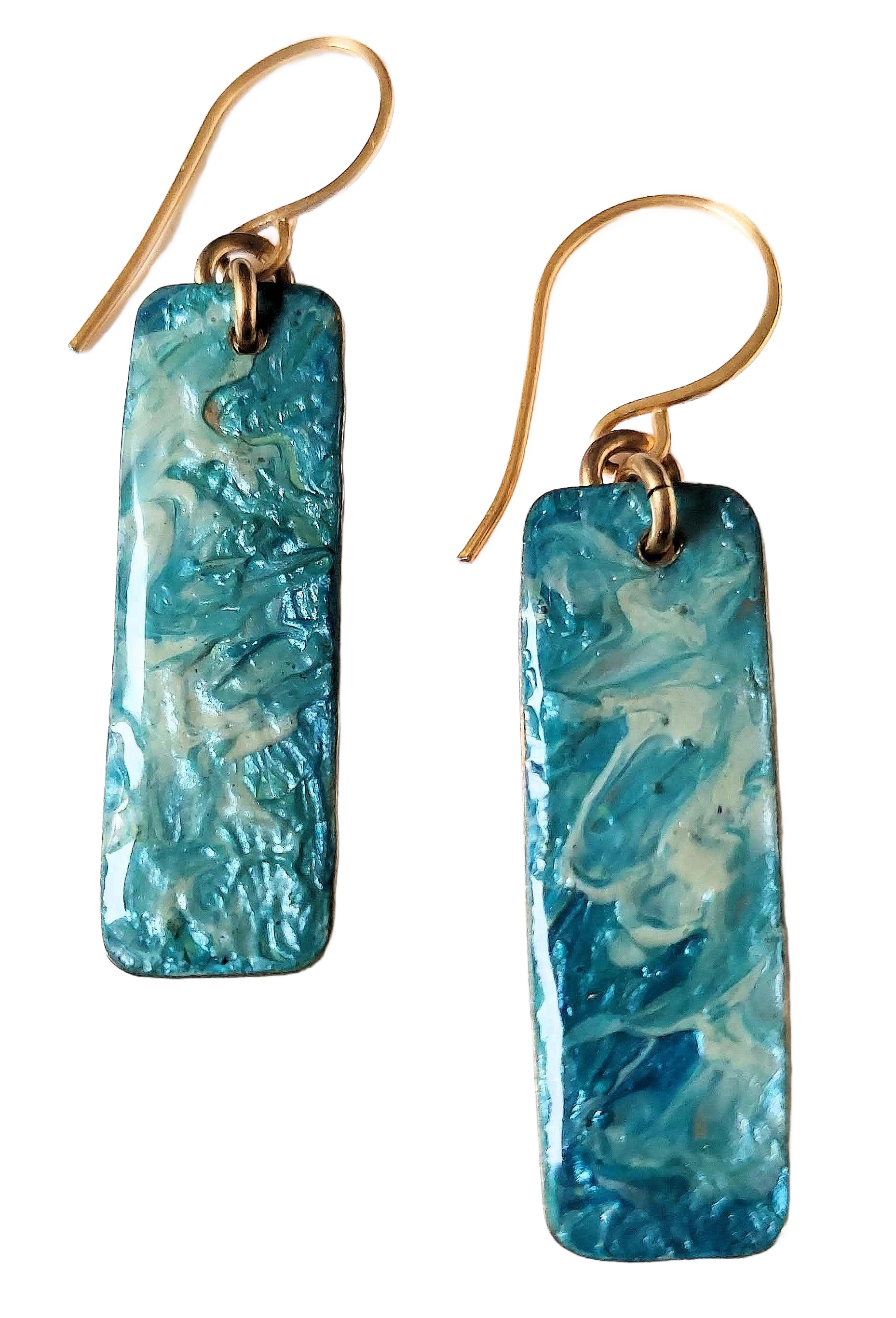 These pretty ocean-blue rectangular bar earrings are handcut from jeweler's bronze sheet. The backs are hammered and the front of the earrings are handpainted with acrylics and then coated in UV resin for a glass-like finish. Finished with our handmade 14k gold-filled earwires, the earrings measure 1/2" wide and 1-1/2" long. Arrive in a black satin drawstring pouch for storage.