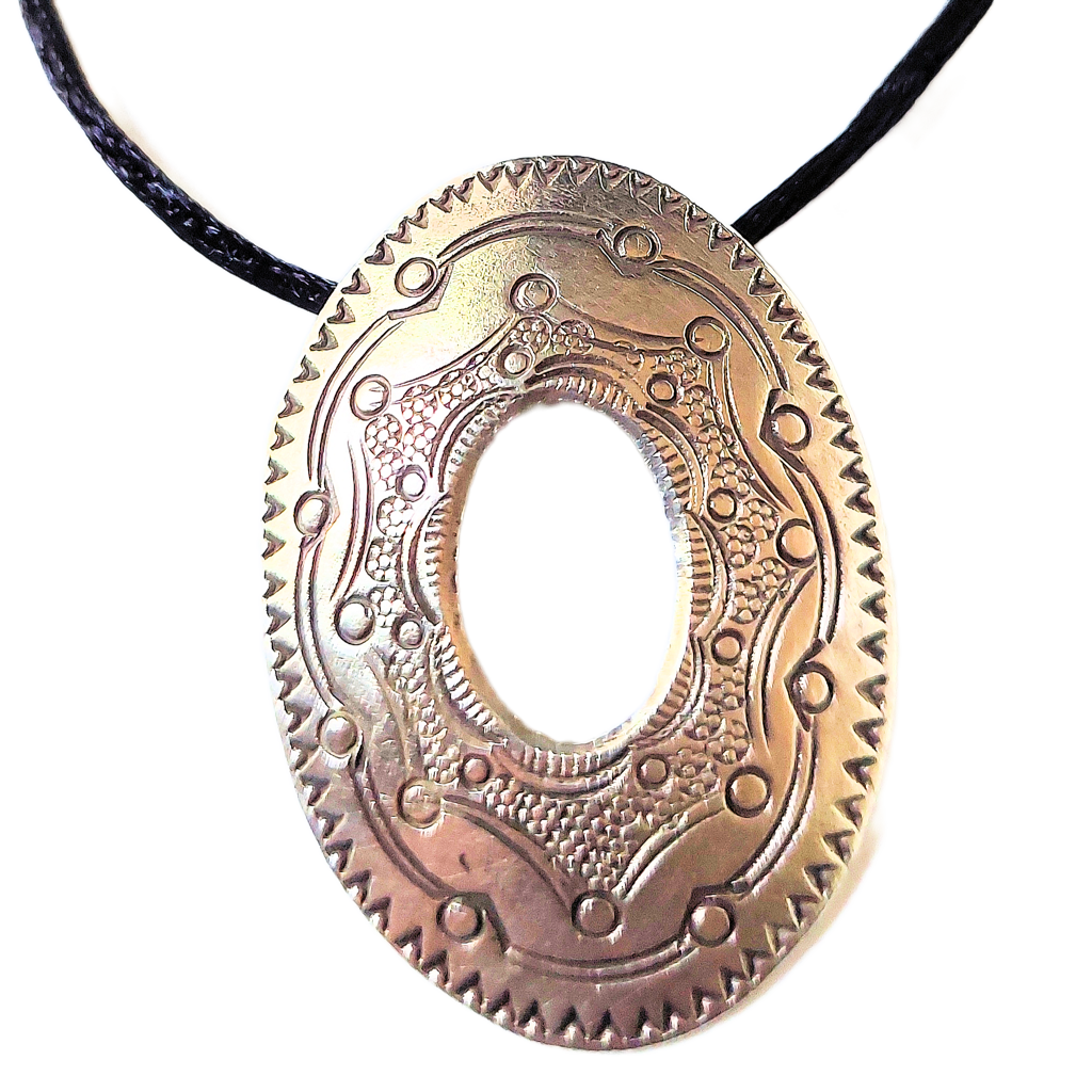 Hill Tribe Fine Silver Oval Donut Pendant Necklace on Black Satin Cord