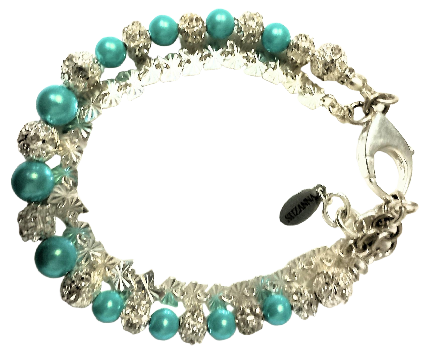 Elevate your style with our exquisite Iridescent Turquoise Green Czech Glass Crystal Pearls, Silver Filigree Beads & Sterling Silver Butterfly Chain Two-Strand Bracelet. This opulent piece showcases 3-8mm and 8-8mm Czech glass crystal pearls in a radiant iridescent turquoise-green shade. Impeccably crafted in the Czech Republic, these simulated pearls are renowned for their luxurious quality and uncanny resemblance to natural pearls. Adorned with dazzling silver-tone filigree beads, this bracelet exudes sophistication and glamour. All components, including jump rings, clamshell crimp ends, spacer beads, and a 1.5-inch extension chain, are meticulously crafted from sterling silver. Complete with a magnificent marquis sterling silver lobster clasp and our signature SUZANNA silver logo tag, this bracelet dazzles! More photos to come. Length: 8 inches + 1.5-inch extension chain.