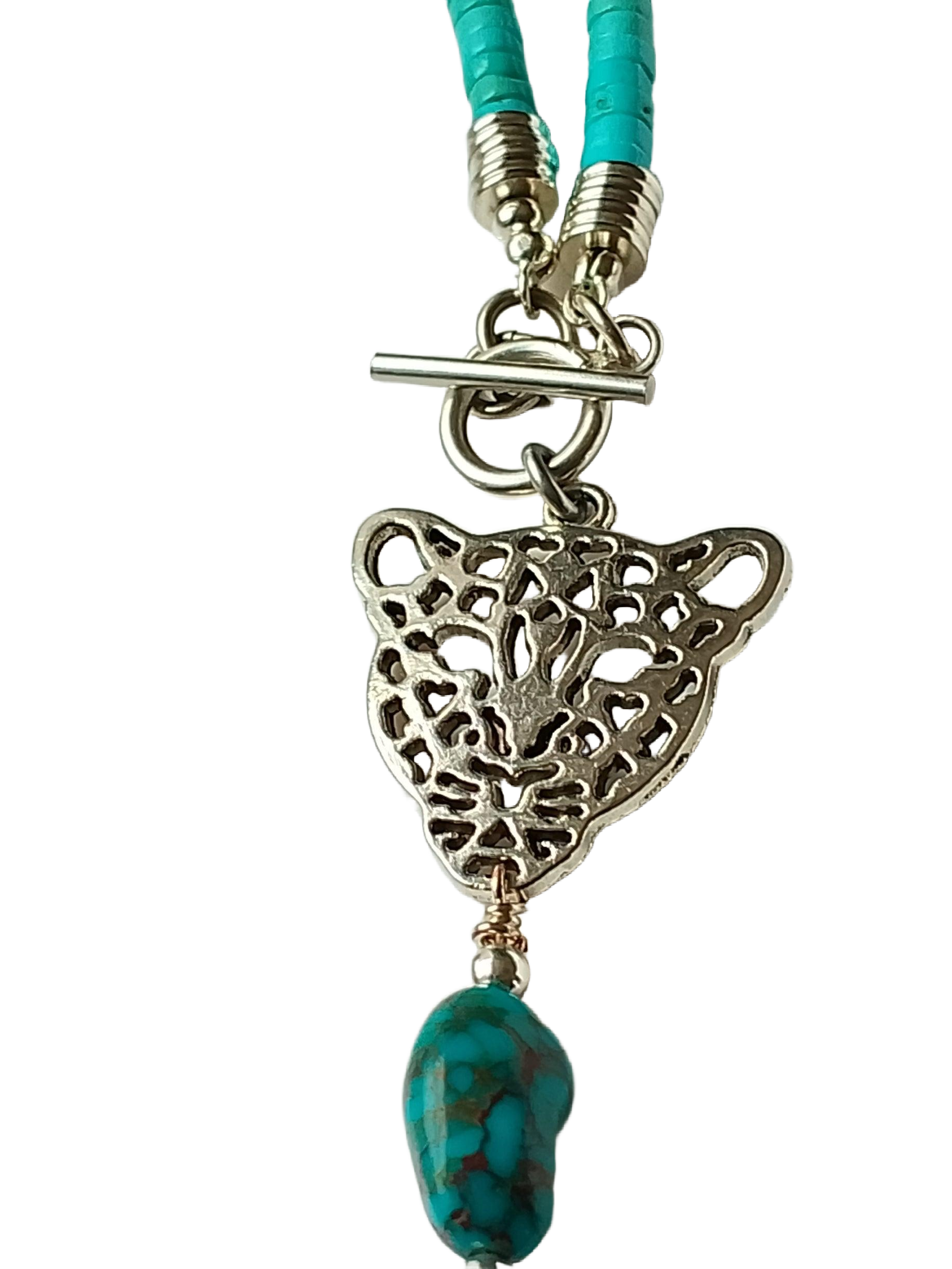 Fearless, Fierce & Fabulous Silver-Plated Leopard Head Pendant with Natural Turquoise Nugget & Heishi Necklace