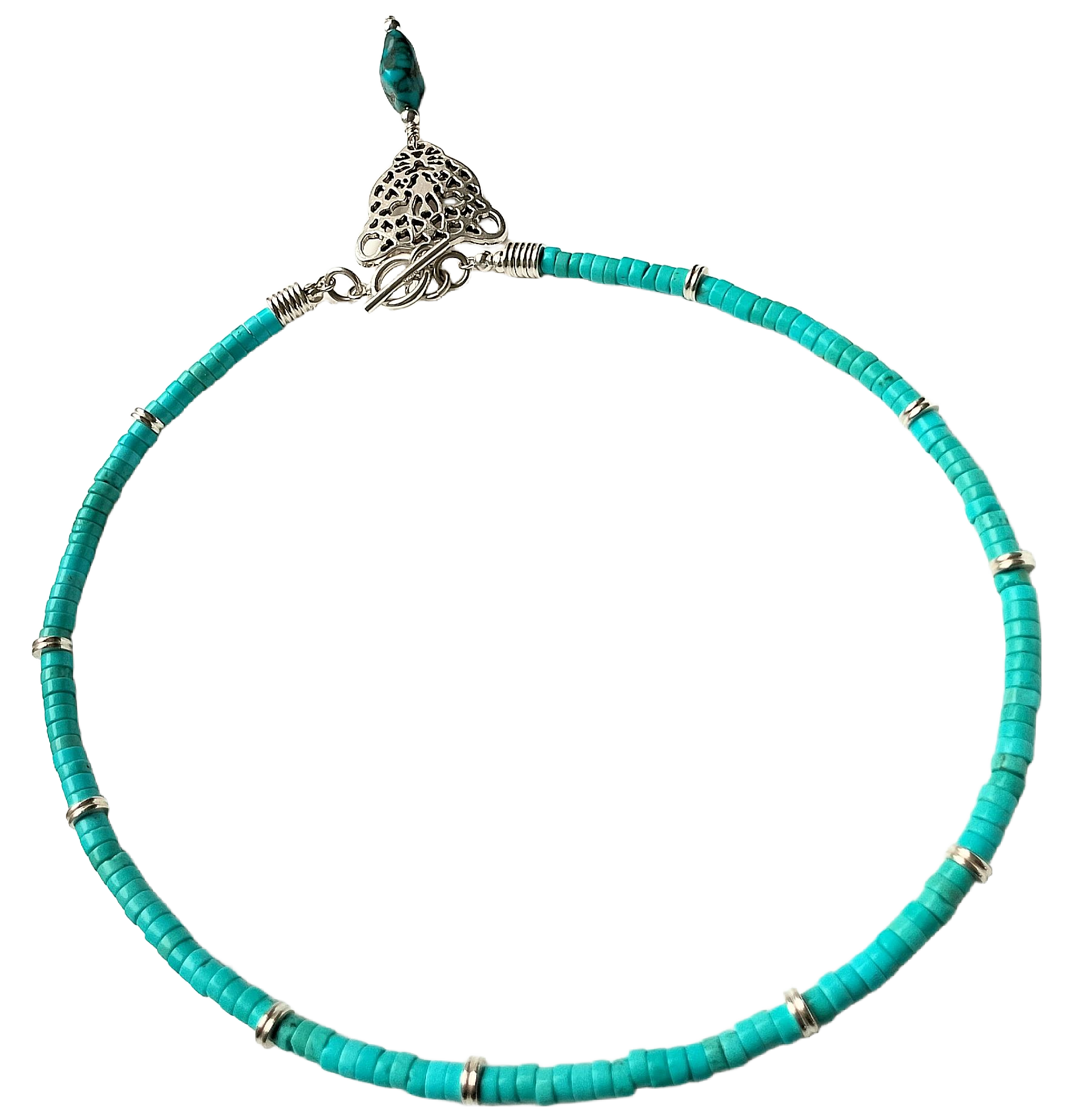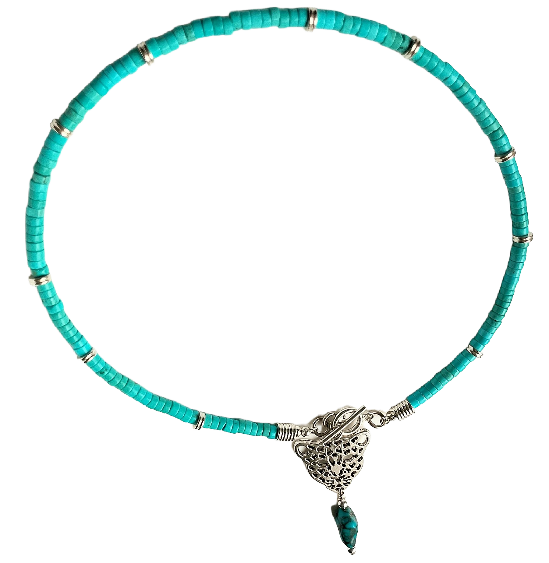 Introducing from our May 2025 Collection, the Fearless, Fierce & Fabulous Silver-Plated Leopard Head Pendant Choker Necklace adorned with a Natural Turquoise Nugget and Turquoise Heishi Beads. This unique piece adds a touch of coolness to the classic turquoise choker. The high-quality natural turquoise nugget boasts a rich turquoise color with striking dark brown patterns. Shimmering silver spacers add an elegant touch throughout the necklace. Every detail, from the crimp covers to the jump rings, is crafted from sterling silver.