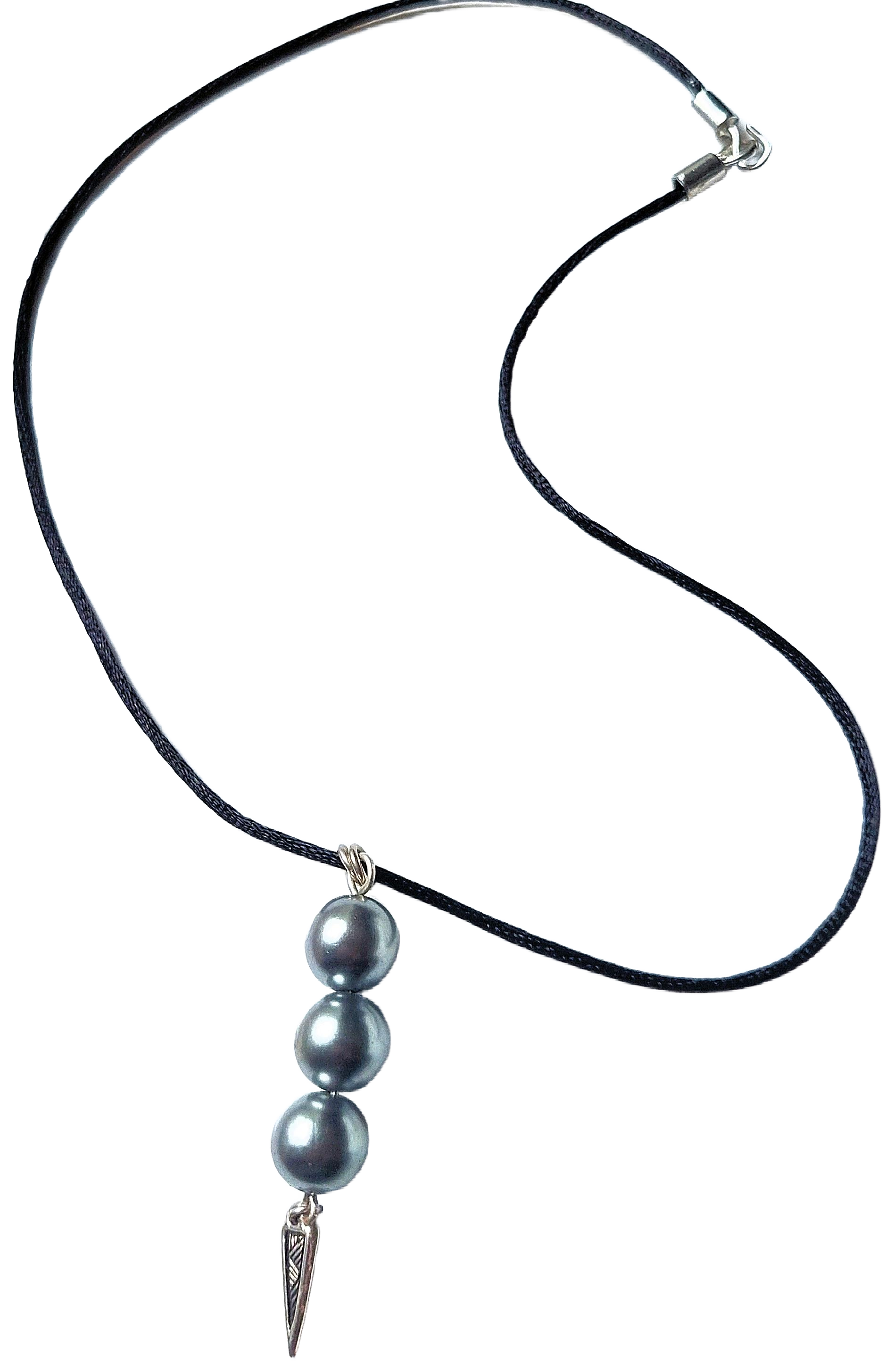 Our Soft Gray Glass Pearl Trio Necklace features three shimmering dove gray faux pearl beads and an antique silver-toned spike charm, about 2-1/2" long. This 19-1/2" silk cord pendant necklace exudes sophistication. With a silver-toned hook and eye clasp, elevate any outfit with this elegant piece.