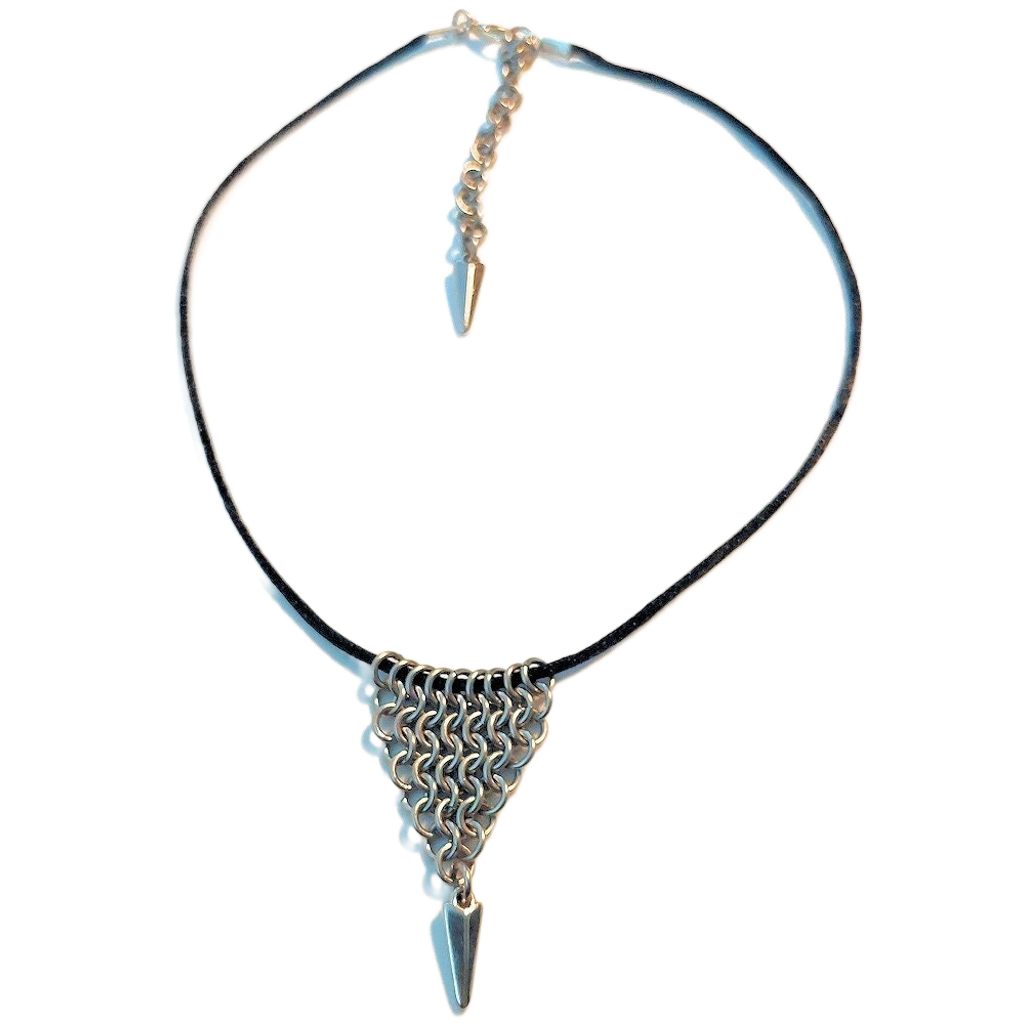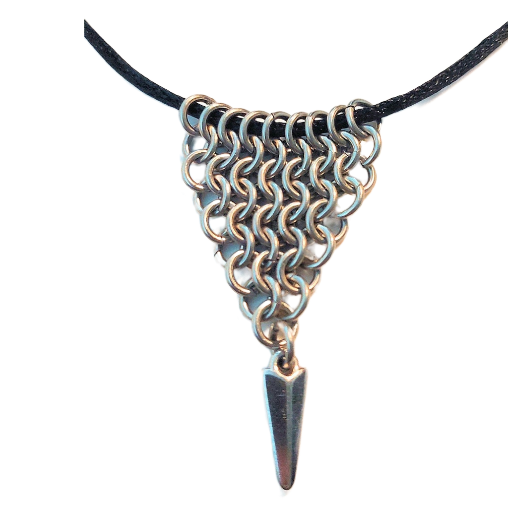 Woven in the traditional European 4-in-1 chain maille pattern, the Stainless Steel Chain Maille Leaf/Half-Diamond Pendant features lustrous and durable stainless steel jump rings. Strung on a sleek black satin cord, this classic chain maille weave pendant can be worn as a choker or a standard 18" length. Elevate your style with this elegant pendant necklace.
