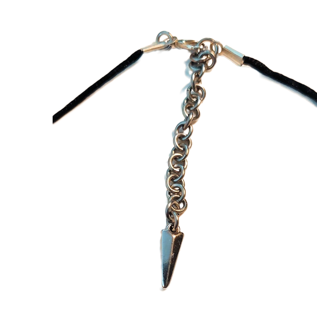 The black satin cord is about 15" choker length with a 3" extension chain finished with a matching silver-plated spike charm.