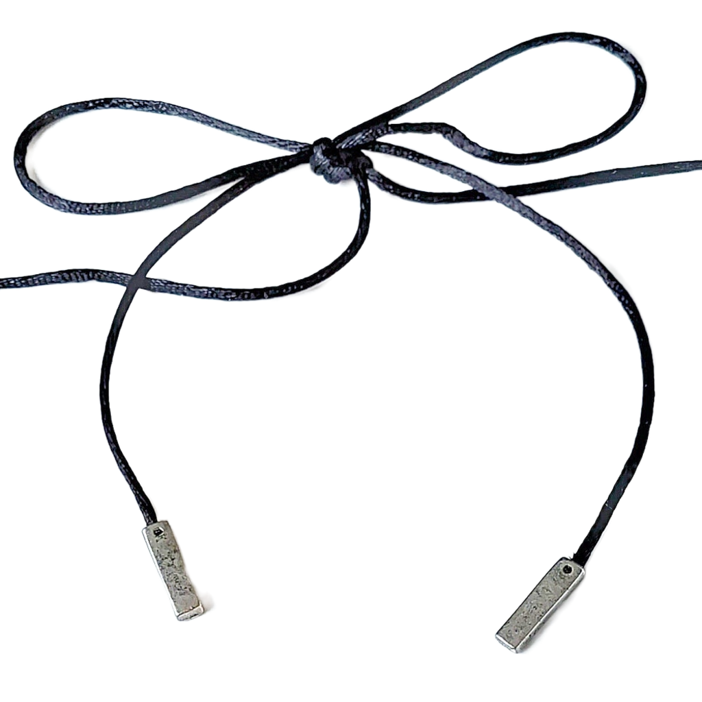 Stainless steel 18 gauge jump rings are woven one at a time directly onto the cord to create the pendant. Silver-plated spike drop. The black satin cord is 48" long.The pendant with spike charm is 2" overall.