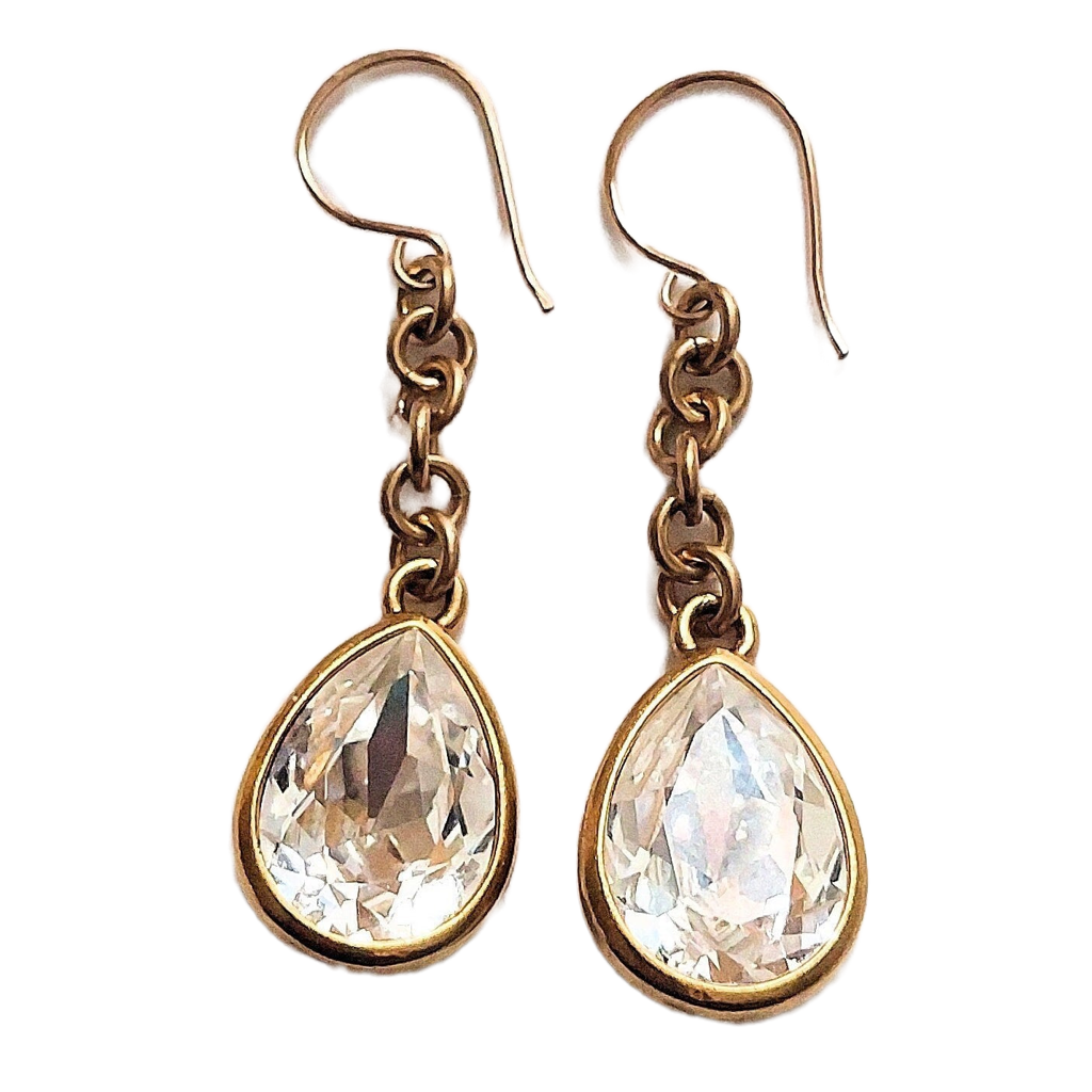 Big 3/4" long, 1/2" wide multi-faceted Swarovski crystals embedded in chic gold-plated bezels and suspended from a handmade 1-in-1 brass chain with handmade 14k gold-filled ear wires make a gorgeous pair of earrings that are sure to make any dressy ensemble pop! Hang 2" overall.