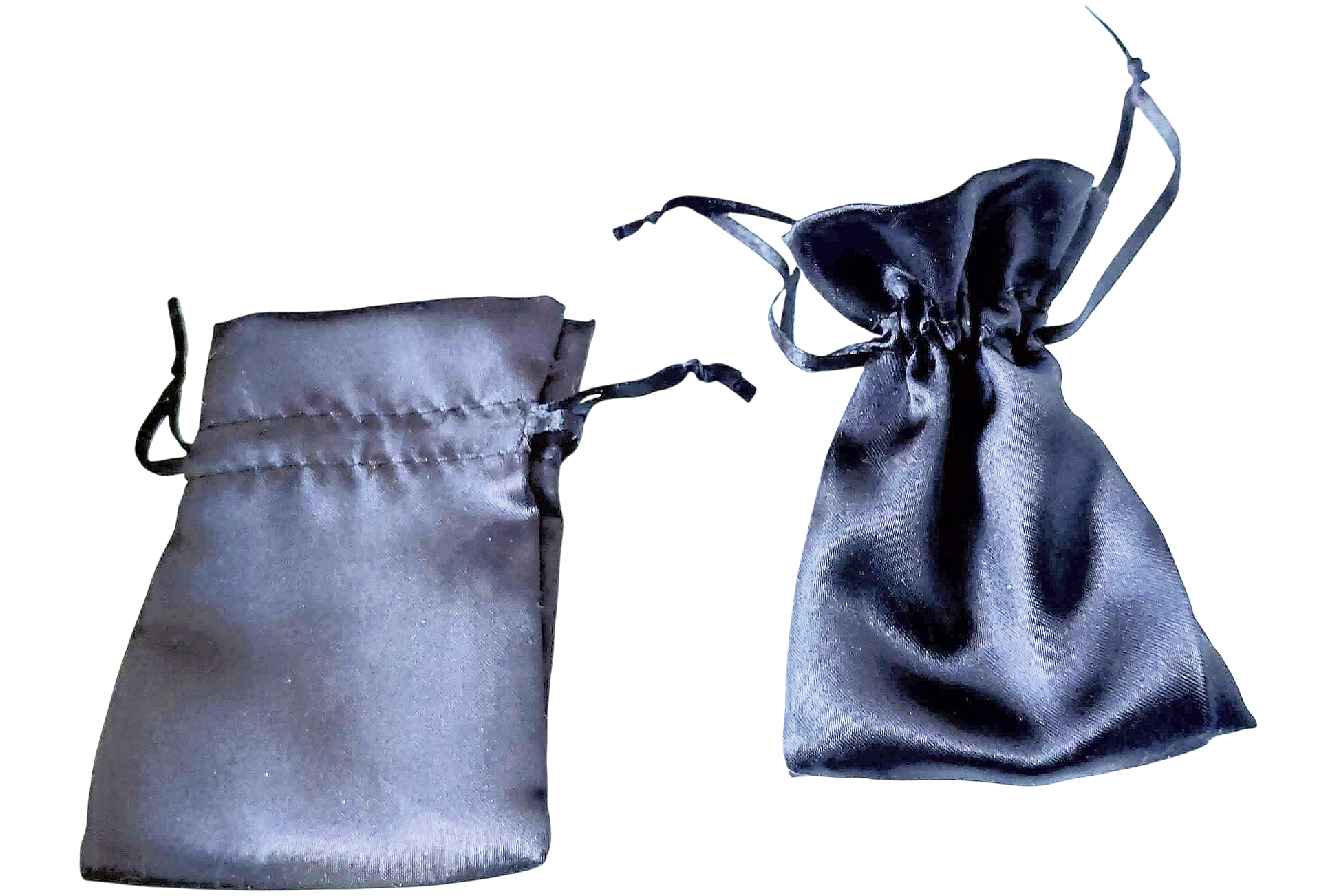 - Your necklace arrives in a black satin drawstring storage pouch. For gift-giving, a black paper gift bag with gold accents and black satin ribbon handles is included.a