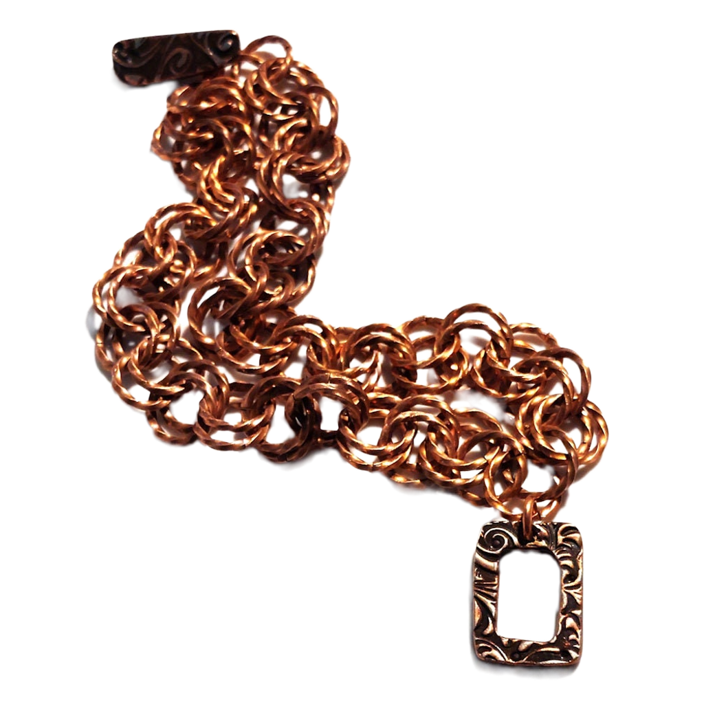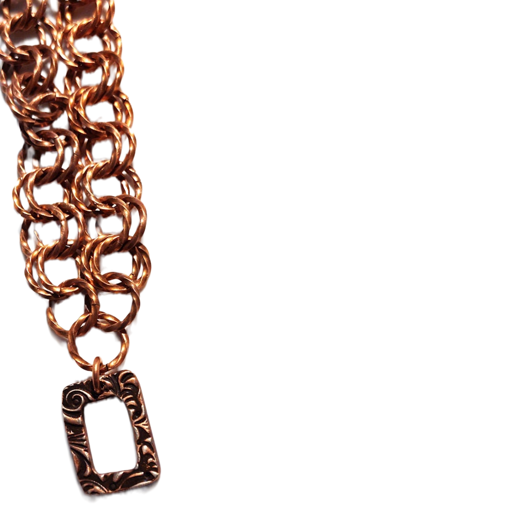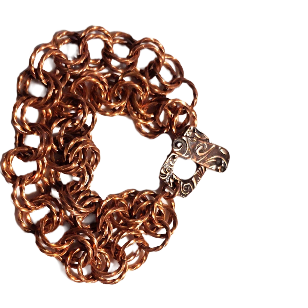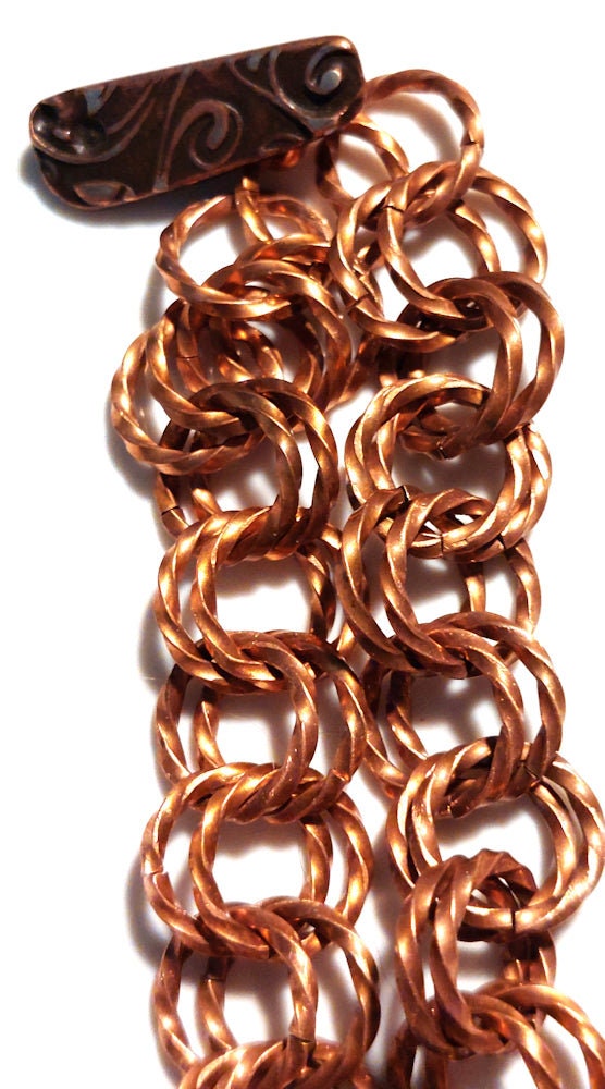 Large twisted copper rings are woven into two substantial 2-in-2 chains, then joined side-by-side for a chunky, cool look. Lightweight with a slinky feel and tinkling sound, this copper bracelet is perfect for everyday wear.TierraCast (made in the USA) antiqued copper-plated pewter toggle clasp features an embossed design on both sides. Measures 7" overall.