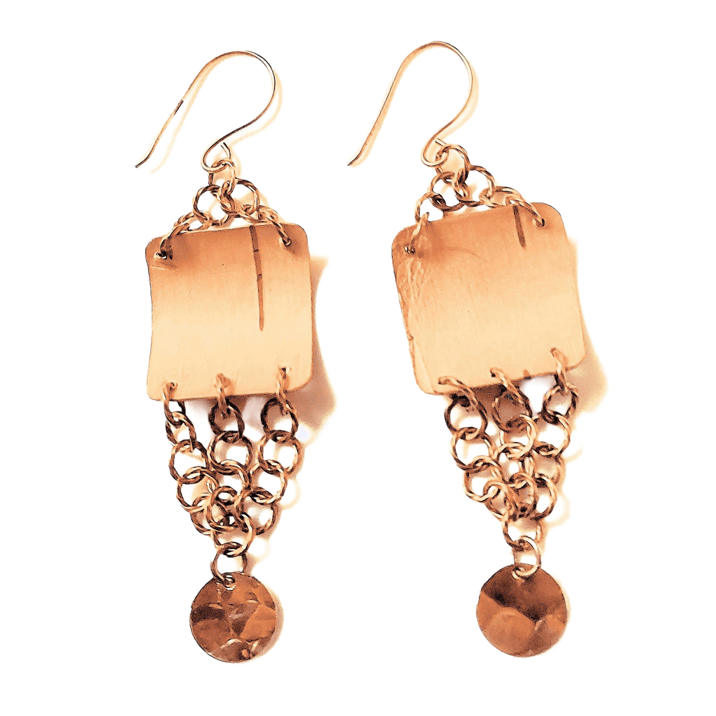 Birch bark responsibly harvested from naturally fallen white birch trees on my rural Ontario property is boiled, scrubbed, sanded, hand cut, and filed into 3/4 inch squares. The gently curved side is painted with a blend of ink colors to create these eclectic, one-of-a-kind vibrant grape-colored earrings that are as light as a feather. Striking and elegant, the earrings feature twisted brass jump rings forming a triangular chain at the bottom of each earring with a vintage gold-plated, hammered circle charm attached. The back concave side of the earrings is natural, unpainted, velvety soft birch bark. These statement earrings hang 2-3/4 inches from handmade 14k gold-filled ear hooks. Birch bark is organic and retains natural imperfections such as bumps and ridges, and the horizontal pores (lenticels) through which the tree can breathe lend character to any jewelry created with this eco-friendly natural material. Arrives in a black satin drawstring pouch.